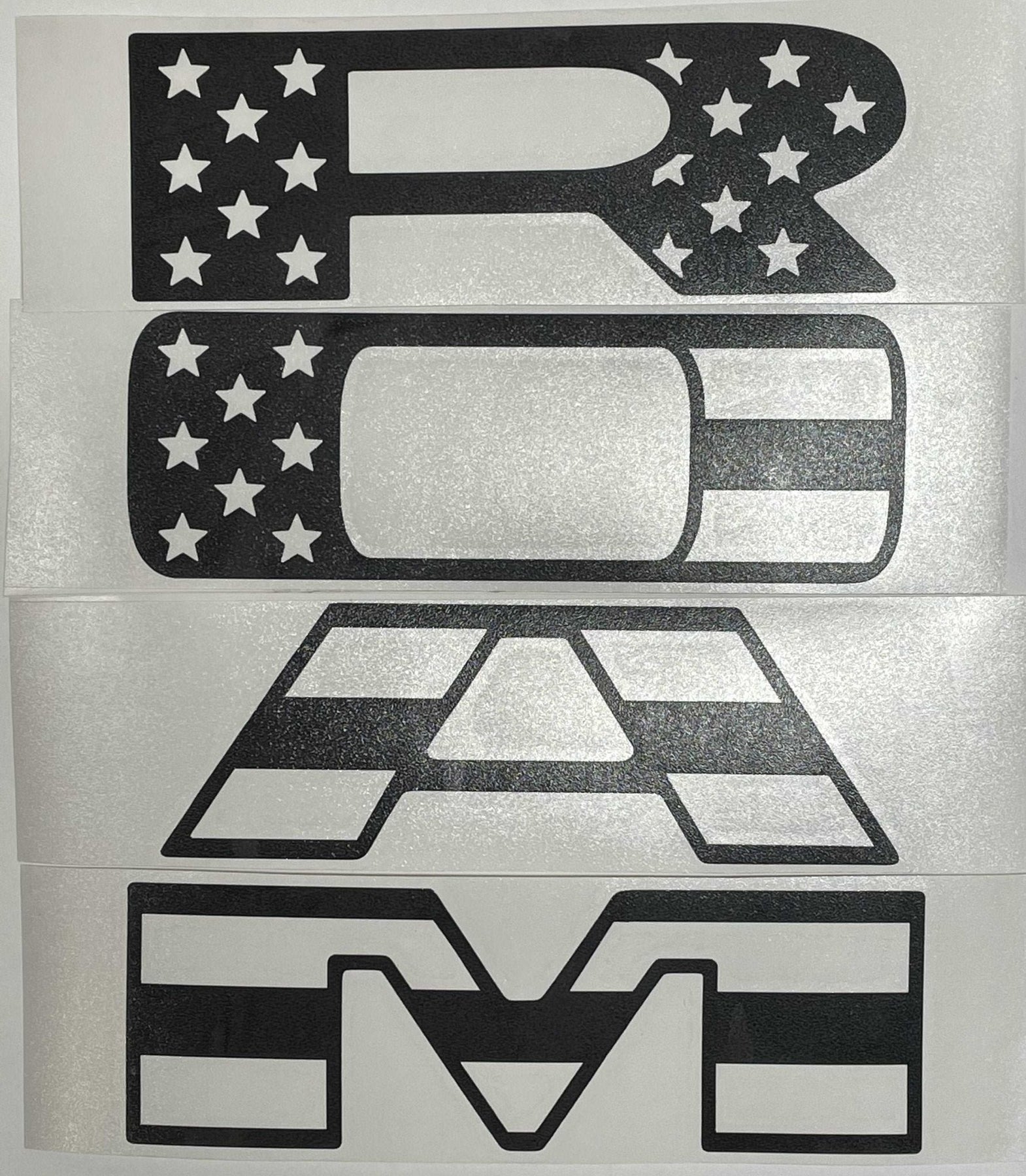 Customize the appearance of your 2019-2026 RAM with these premium cast vinyl flag decals for your grille letters. Die-cut from matte black vinyl film, these vinyl decals add a subdued flag look to your grille. For these with black grille letters, other decal colors can be requested.